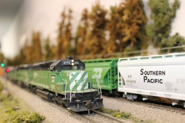 11 scales miles of double main line trackage on 2 levels (over 674 feet), over 170 turnouts, two large yards, a six track passenger station, an 11 stall roundhouse with turntable, a logging mill, diesel repair shop & diesel facilities, two towns, a coal/logging operation on a mountain, and two helixes at either end of the layout room make up the OMRS Layout, with a large hidden staging yard underneath it all.